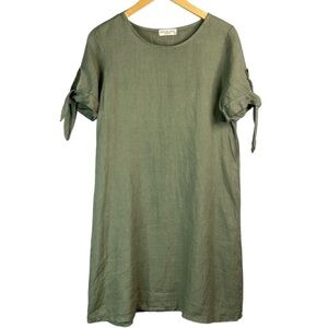 TERZO MILLENNIO Linen Shift Dress Sage Green Tied Short Sleeves Coastal Loose S