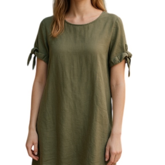 TERZO MILLENNIO Linen Shift Dress Sage Green Tied Short Sleeves Coastal Loose S