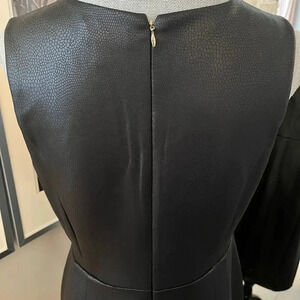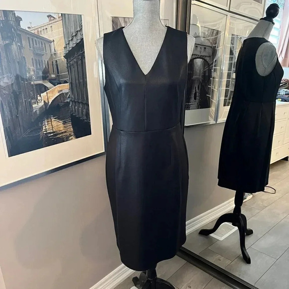 V-neck fitted dress in faux leather material with back zipper closure and side pockets. Made by Thalia Sodi. New without tags.