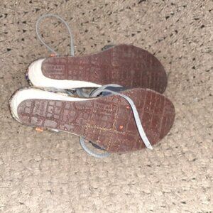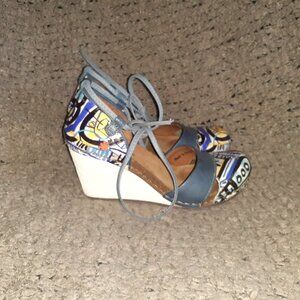 Size 36, about a 5.5/6, measures 9" via insole, 3.25" wide, with 2.5" wedge heel and 44" (in all) leather tie up lace.