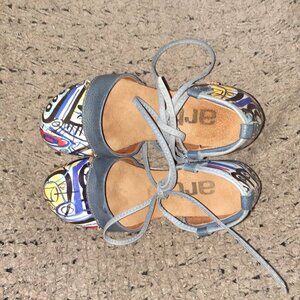 The Art Company Gaucho Bonelyema heels in size 36 feature a unique graffiti pattern on patent leather, with ankle ties for added detail.