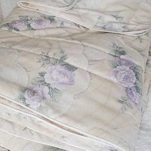 A reversible Twin bed Comforter from The Bay. Larger lavender and beige Floral pattern front, small lavender Floral pattern back. Comes with 1 large pillow case.