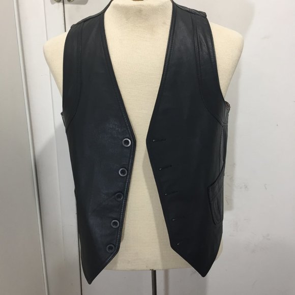 The Boutique of Leathers unisex Vintage Vests, No Label fit Large, Color Black, 100% Leather, Lining, Front Pockets, Patchwork Back, Small Belt Buckle, Closure Buttons, in Good Condition, Lightweight Vest, Made in Canada, Great Look, Great Fitting.