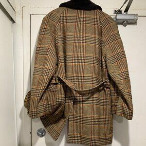 The Downtowner Double Breast Coat, Size 42/L, Missing Fabric Tag, Multicolor Plaid, Wool Blend, Faux Fur Partial Lined, Collar Faux Fur, Side Pockets, Shoulder Pad, Back Vent, Closure: Double Breast Buttons, Good Condition, Unisex Belted Coat, Great Look, Great Fit.