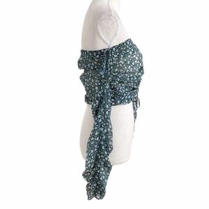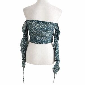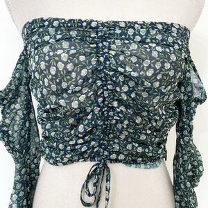 THE EAST ORDER FLORAL CINCHED LACE UP OFF THE SHOULDER SHEER CROPPED TOP