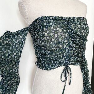 REVOLVE THE EAST ORDER FLORAL CINCHED LACE UP OFF THE SHOULDER SHEER LONG SLEEVE CROPPED TOP, This is a super feminine, girly, bohemian / boho free -spirited summer cropped top in a green and white floral print - sheer with a lace up style on the front and on sleeves for a cinched allover look - off the shoulder style - side zip - stretch yet fitted, sexy and super lightweight top with a bralette for festival with denim shorts or a mini skirt for a night out with friends - platform, lace up sandals or heels.
