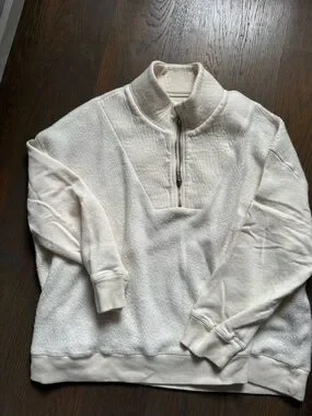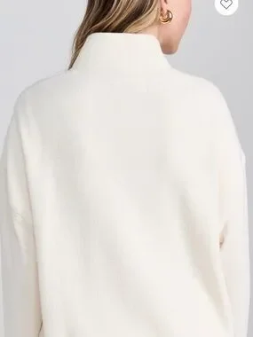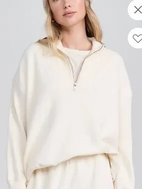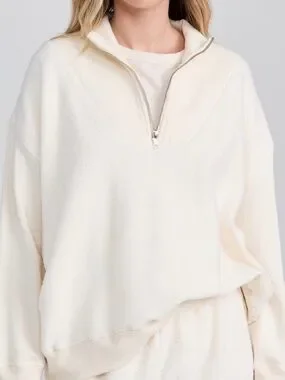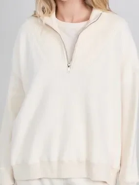 Lightweight cream pullover with a relaxed crew and half-zip front. Soft knit fabric for easy layering. Minimal, polished silver zipper detail.