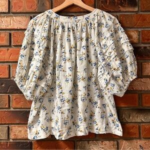 Inspired by printed vintage blouses, The Carriage Top. is as easy as it is voluminous. Tiered short, puffed sleeves are finished with elastic for an exaggerated silhouette, while delicate pintucks add detail to the bodice. Cut from rose printed cotton that nods to beautiful embroidery found on vintage keepsakes. 100% cotton.