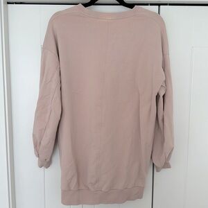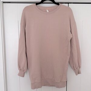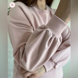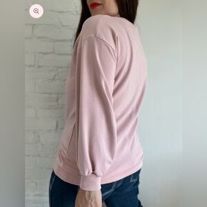 This is a pullover sweatshirt with a crew neckline and dropped shoulders. It's made with heavyweight French terry with a looped back, soft drape and a breezy feel. This fabric is sourced from Italy. The pink is discontinued, and it retailed for $88. Good preloved condition with some light piling. Please note there is a small discolouration to the back neck area but difficult to see unless looking closely (see photo)