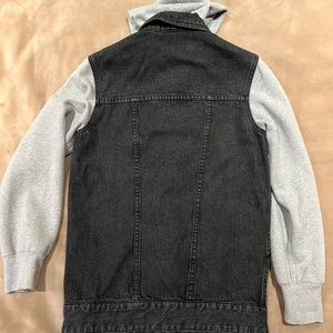 THE HUNDREDS jean and grey hoodie jacket all in one with button pockets and slash pockets in the front. Jacket is in excellent condition.