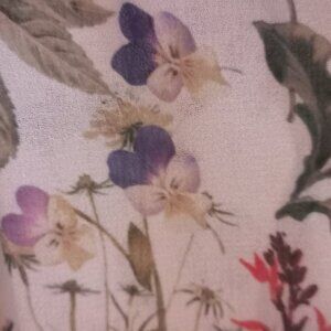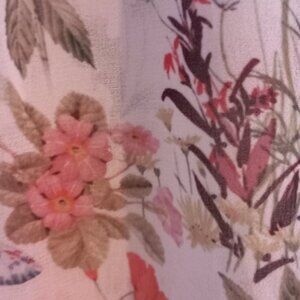 Light and flowy fabric printed with flowers, plants, butterflies and ladybugs