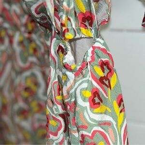 Robe portefeuille chic avec un imprimé floral éclatant dans les tons de rouge, jaune et vert sur fond doux. Manches papillon et jupe fluide, parfaite pour le printemps ou l’été.