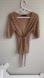 Tan 3/4 ruched sleeve cardigan with smocking at the back & built in front tie closure in a linen blend fabric offering a nice layer over a camisole, dress or tank top. The fit is generous due to the smocking & tie belt at the waist.