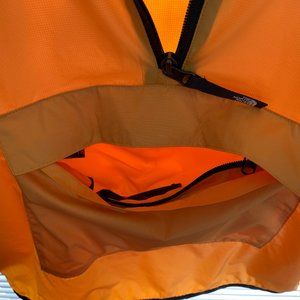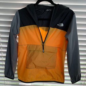 Website description: The North Face Fanorak Wind- and rain-resistant pullover anorak jacket. Half zip front. Color block construction with The North Face logo screenings and left chest and back right. Stows into fanny-pack-style kangaroo pocket. Removable, low-profile fanny-pack straps. Elastic cuffs and hem. Adjustable drawcord hood. 100% polyester. Machine wash