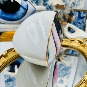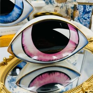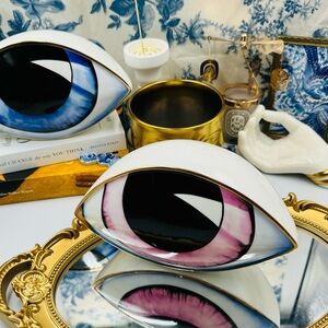 Surrealistic “talisman” of good luck and a traditional symbol of protection, the eye serves as a constant reminder to be aware, to dispel negative energy, and to seek beauty in the everyday. The eye is also a point of connection between two souls. THE PROCURESS COLLECTION All-Seeing Eye is a celebration of that connection. This whimsical and surreal decorative objects is handcrafted in porcelain with 24-karat gold leaf.