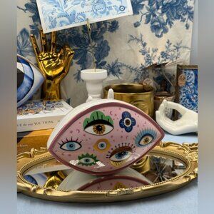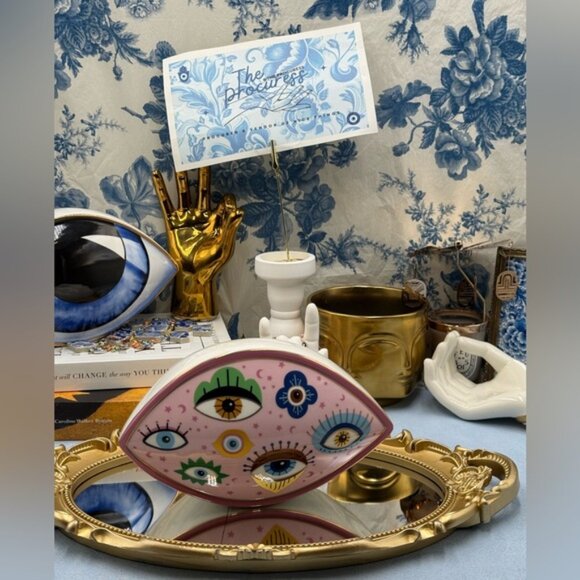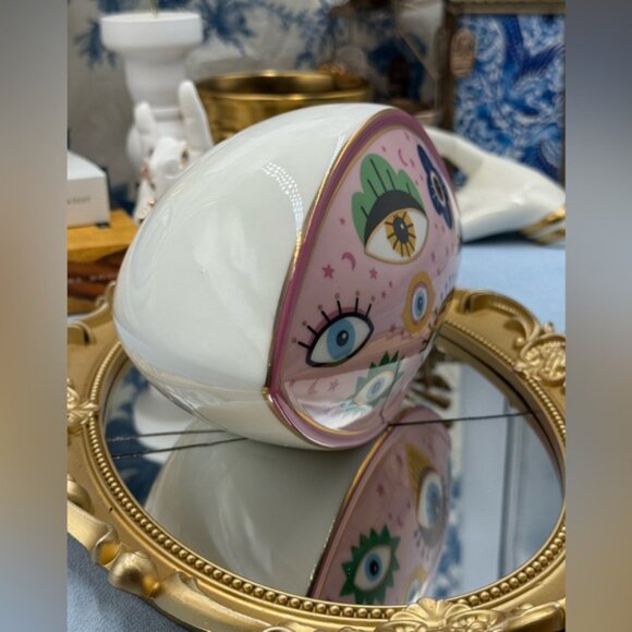 THE PROCURESS COLLECTION All-Seeing Eyes Paperweight honours the beauty of the Evil Eye Amulet. This whimsical and surreal decorative object is painted over porcelain with 24-karat gold leaf & enamel.