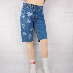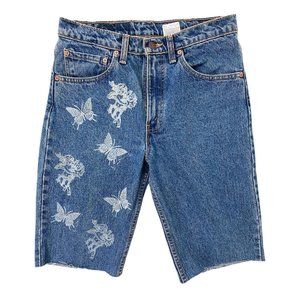 🍓ABOUT: Hand Block Printed Cherub and Butterfly Vintage Levis Shorts. Sweet Levi’s raw hem denim shorts with white butterfly 🦋 and cherub angels 👼🏼 stamped on leg and back pocket. Gentle wash safe.
