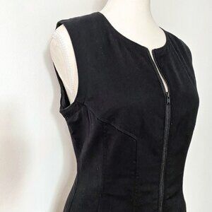 THEORY BLACK SILK BONBI FRONT ZIP SLEEVELESS A-LINE FIT & FLARE DRESS, This is an a-line fit & flare classic black silk dress - sleeveless with a front zipper fastening full length on the front - lined - scoop neckline - stretch and comfy yet fitted, classic yet modern, perfect for a day to night work to cocktail dress, first date to party, versatile little black dress with heels or boots for fall and winter seasons.