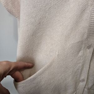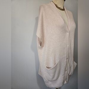 Relaxed fit cashmere cotton knit sleeveless sweater. Lightweight with two front pockets. Deep V neck with a full front button closure.