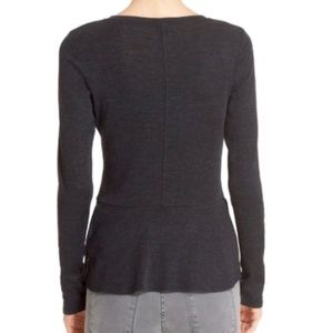 Theory Malydie peplum sweater. Colour: Dark Heather Grey. SIZE: S. (armpit to armpit measures 15.5") Merino wool pullover sweater features long sleeves, crew neck, a peplum hem with side slits for a modern look and maximum mobility. Fabric Content: 100% merino wool. Sweater is in very good pre-owned condition. Minor overall wear. No stains or rips. Has been freshly dry cleaned for this listing. Retail: $ 180 USD