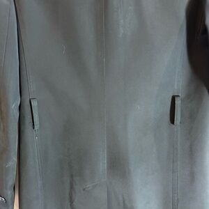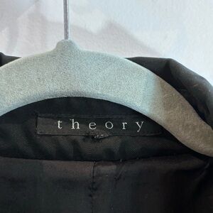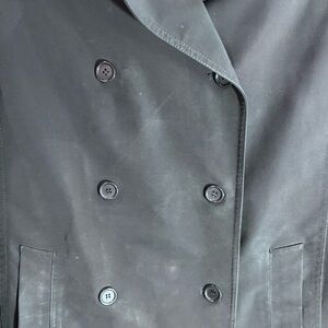 THEORY Sz M (estimated from measurement as there is no size tag) Canvas Pointy Lapel Double Breasted Lined Pockets Trench Coat Jacket. Original belt missing. Bring your own and give this piece a unique customized look that is all your own. Sophisticated. Contemporary. Minimalist. P2P: 20” Sleeve: 25” Length: 32”