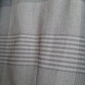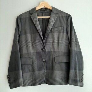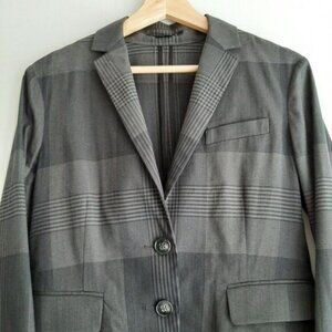• Sophisticated and stylish single breasted two button closure blazer jacket in grey plaid pattern, unlined with notch lapel and double back vent.
