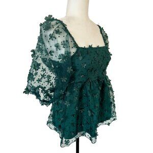 THIRTY THIRTY LA Short Sleeve Top Blouse Size Medium Green Flower Chiffon Lined