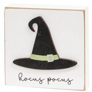 Bring a little magic to the farmhouse this Halloween with the Hocus Pocus Witch Hat Block. This fun block has a black, dimensional witch hat with green band and silver buckle. Below the hat, the words ‘hocus pocus’ are scrolled in black script. Add this block to table top displays with candles and pumpkins for a wicked Halloween display. Measures 3.5" square with a .75" depth and has a keyhole hanger.