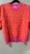 Vibrant pink sweater with orange heart pattern. Features crew neck and short sleeves. Perfect for casual outings.