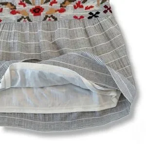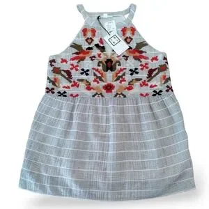 Feminine floral and bird embroidered linen cotton blend halter top. Fitted bust and flowy waist and hips.
