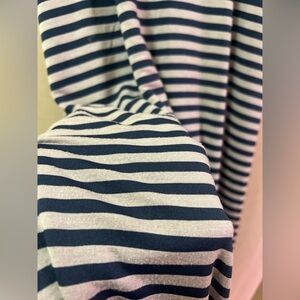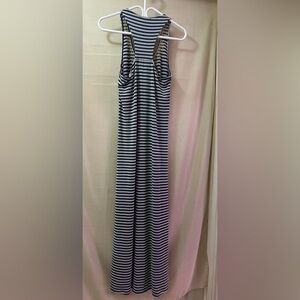 Blue and grey striped maxi dress featuring a yellow crochet neckline. This lightweight fabric makes it ideal for summer or any vacation! Size medium.
