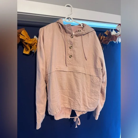 Linen like material pull over style Shackett with buttons and a waist adjustment.