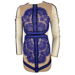 THREE Floor Nude Mesh and Blue Lace Mini Evening Dress