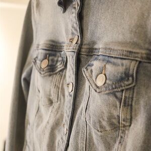 Beautiful denim jean jacket in a size small. item is pre-owned but has no flaws, holes, smells or stains. It is in extremely good condition!! Features side zippers, chest and side pockets and is very sturdy.