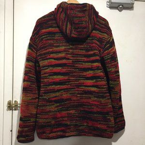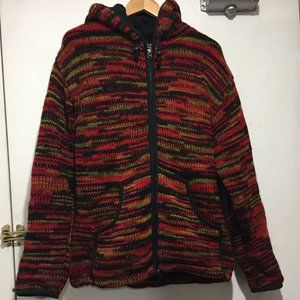 Tibetan Village Unisex Knitted Hoodie Jacket, No Label Fits a Size L/XL, Knit Multicolor Wool Pattern, 100% Wool, Lining, Side Pocket, Closure Zipper, Sleeves Trim Small Pulling, Lining Thread Pulling but in Good Condition, Beautiful Jacket, Great Look, Great Fitting.