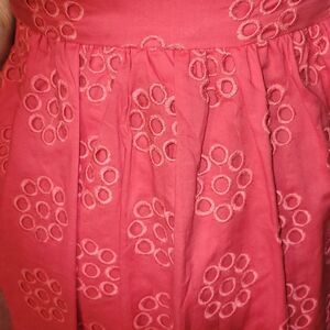TIBI RED EYELET Strapless Casual Dress. Dress is fully Lined. I believe it is 100% cotton. Chest is 26" / Waist is 24" / Length is 27" . There are strings in the centre front if you wish to tie behind your neck. This dress is in great condition. Should you have any questions please message me. Thank you for stopping by my Boutique.