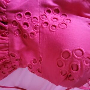 TIBI RED EYELET DESIGNER STRAPLESS padded mini dress. Cotton. Boning in top. Fully lined. Measurements in photos.