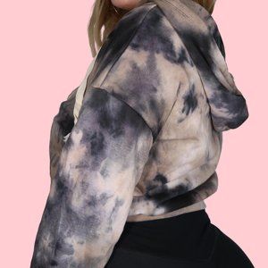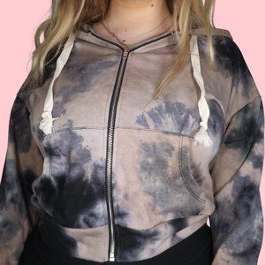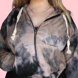 - extremely cute loose-fitting tie-dye hoodie with a zip front + white drawstrings