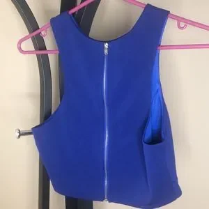 Really cute, royal blue crop style top with a cute stomach cut out. Comes lined with a zipper on the back.