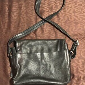 TIGNANELLO Messenger Leather Bag Black With Magnetic Snaps. Soft leather. Roomy with 3 compartments and zipper compartment at the front. 12 x 9.5 x 3 inches or 31 x 24 x 9 cms
