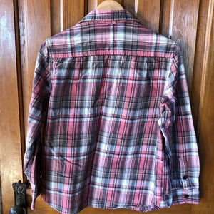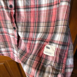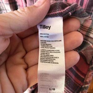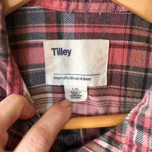Size large button up made by Tilley. Pink, beige, white and brown plaid. Button up front.