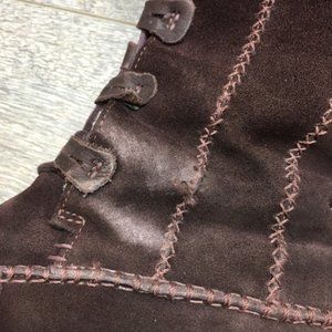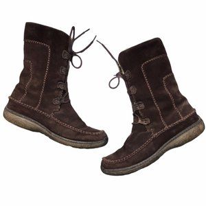 Suede upper in a casual mid-calf cold weather boot style with a round moc toe. Moc stitching at toe, criss-cross stitching throughout, rubber toe and heel wraps. Leather lacing at front of shaft for function and style. Snuggly faux fur lining for warmth, cushioned insole, flexible cork-wrapped midsole, rubber traction outsole for traction and durability. 9 inch shaft, 10 1/2 inch circumference. 1 inch heel.