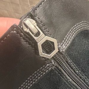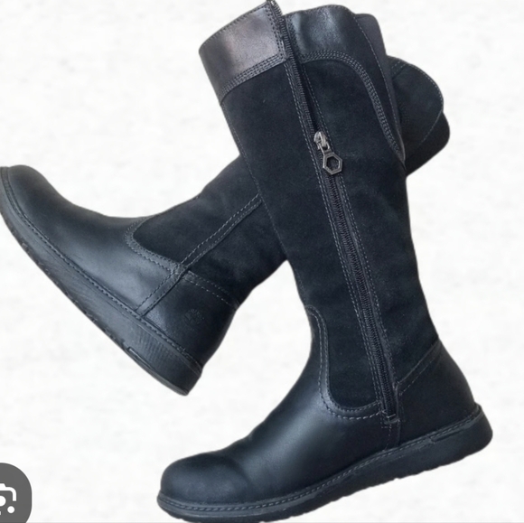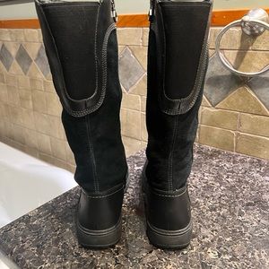 Beautiful black leather and suede tall boots. Ideal for fall or winter. Durable rubber outsole for superior grip and traction. Timerband stamp logo bottom back heel of each boot.