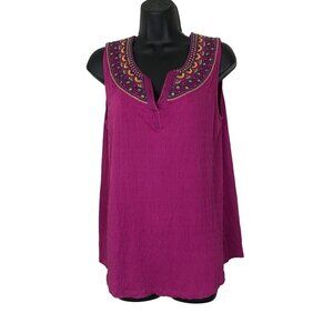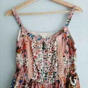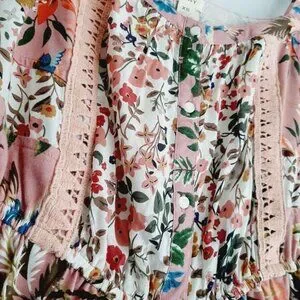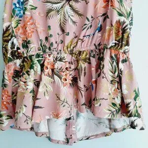 • Pretty tank top in pink, rose, white, blue, and green flower pattern with ruffled peplum hem and button front detail.
