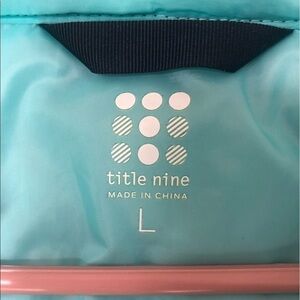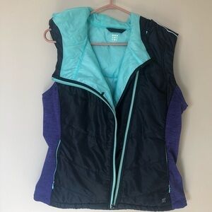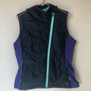 Title Nine Will Power hooded vest, size Large. Color is dark Navy, teal lining and accents and purple side panels. Insulated front, back and hood. Stretchy athletic panels on side for flexibility. 2 large inside pockets, reflective accents, zippered pockets. Pit to pit measurement is 21 inches and length is 25 inches.