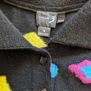 Funky geometric jacket/sweater made in Montreal by TIb Designs. Retails $138 CAD. Black with green, pink & blue diamond shape pattern. Interesting 3D illusion buttons, straight collar, uneven hem. Such a cool piece! Lots of 80s vibes