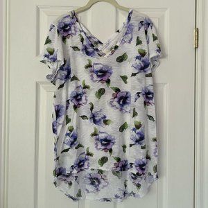 T.La t-shirt, white with purple flowers, short sleeves, V-neck, 50% cotton, 50% modal, size L, purchased at Anthropologie, worn only a few times.