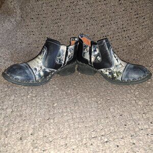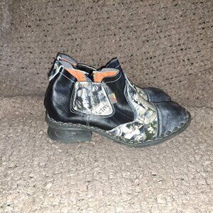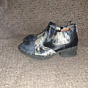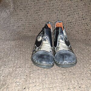TMA EYES-Germany-Denim Newsprint Leather-Side Zip-Booties-Sz 8.5-Excellent