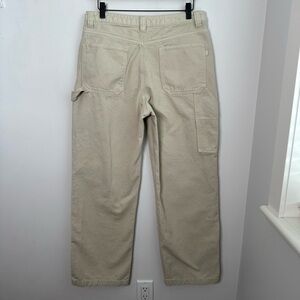 These are relaxed high-rise carpenter pants with utility details like side patch pockets and a hammer loop.