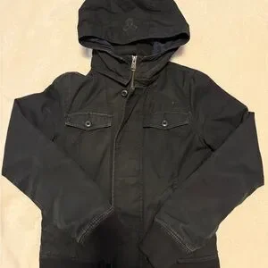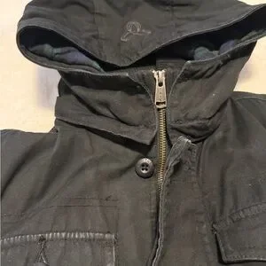 Black hooded field jacket with button-flap chest pockets. Zip-and-button front closure. Ribbed cuffs and hem for a snug fit. Flannel interior.